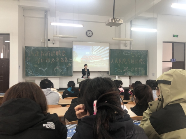 招聘会上,医院人力资源管理科黄乐辉科长和护理部杨琳副主任分别介绍了本次招聘岗位、职业发展和薪资待遇等学生关注的热点问题,同时与学生进行了亲切交流,现场气氛融洽热烈。100余名护理学专业、医学影像学专业、药学专业的学生参加此次宣讲招聘会,40余名学生通过现场和线上方式投递简历。