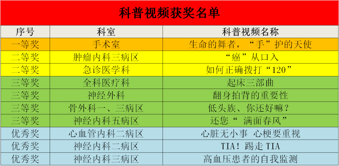 通过本次科普微视频大赛,提高了医院护理人员科普健康宣教能力,在今后的护理科普工作中,我院护理团队将不断创新护理科普形式,持续改进科普健康教育工作质量,为红岸百姓提供更加科学专业、优质、亲情阳光的护理服务。