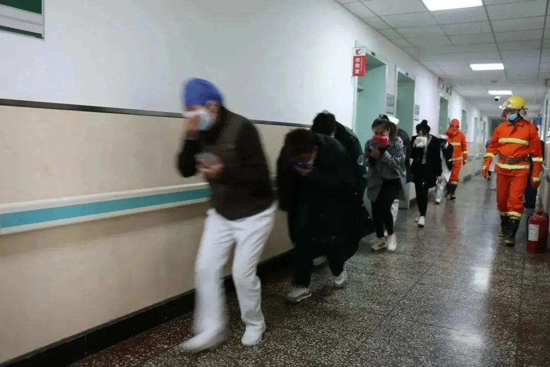 随着总指挥艾立辉副院长一声令下,消防应急演练开始了。演练模拟火灾现场发生在我院神经内科三病区,医护人员发现初期火灾,第一时间报警并拉响警报,医护人员和医院安保人员进行自救,形成第一防线。现场随即指导疏散人群使用湿毛巾捂住口鼻,引导和协助病人及家属低头弯腰从疏散通道有序疏散至安全场所,避免拥挤踩踏。整个演练过程忙而不乱,紧张有序,最终撤离到达安全区域。