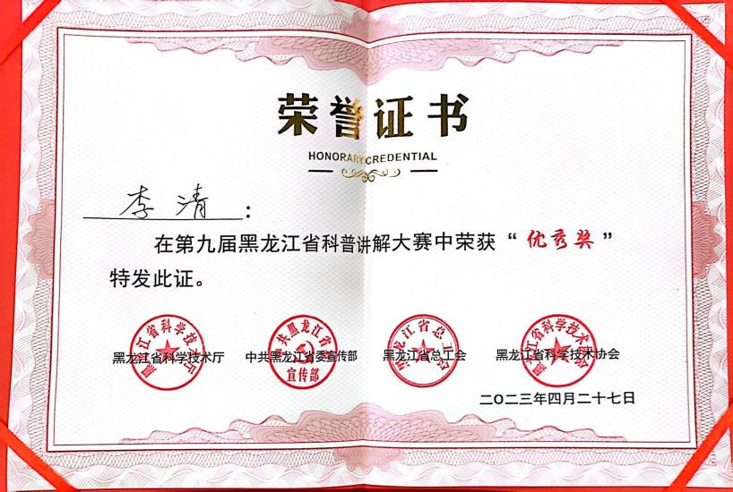 4月27日,第九届黑龙江省科普讲解大赛在黑龙江省科技馆成功举办。来自全省各单位推选出来的103位优秀选手同台竞技。经过激烈角逐,代表学院参赛的护理学院李清同学排名第43位,荣获大赛优秀奖。