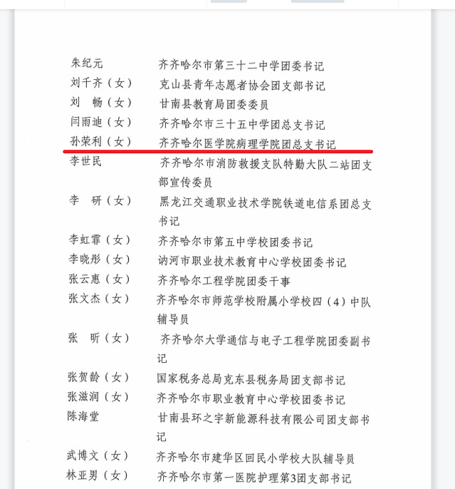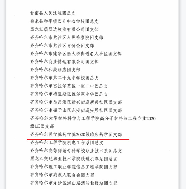 近日,从共青团齐齐哈尔市委员会获悉,学院8个集体(个人)在全市五四评优中获奖。其中,学院“肿瘤表观遗传发病机制及靶向药物研发团队”荣获“全市五四青年奖章集体”,药学院2020级临床药学团支部荣获“全市五四红旗团支部”;基础医学院2021级临床医学专业郭美莹、医学技术学院团委兼职副书记王天龙、2021级医学影像学专业于晨曦、护理学院2020级助产学专业张晓茜、药学院2020级药物制剂班团支书芦继苇等5名同学荣获“全市优秀共青团员”,病理学院团总支书记孙荣利荣获“全市优秀共青团干部”荣誉称号。
