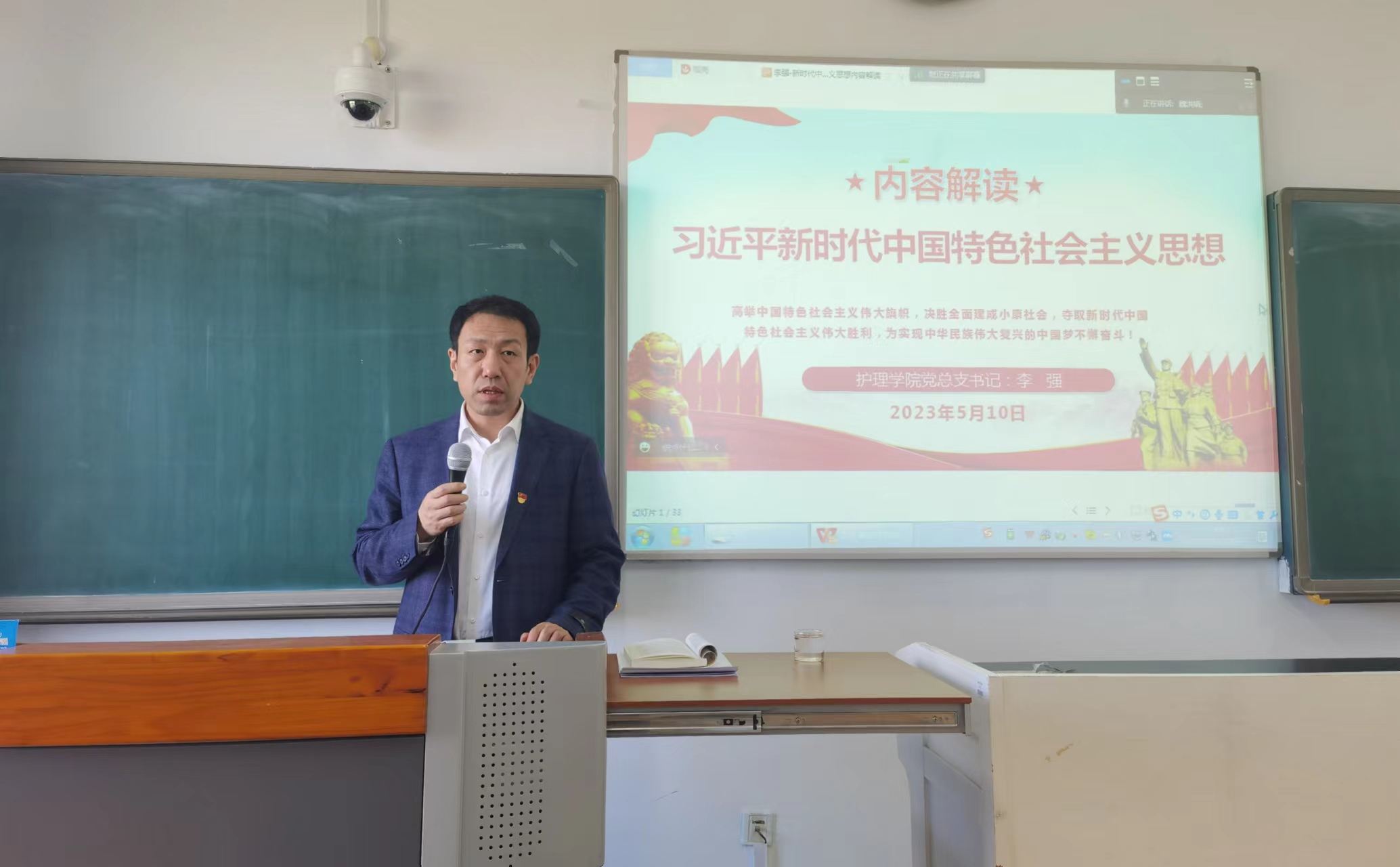为全面贯彻落实党的二十大精神,深入开展学习贯彻习近平新时代中国特色社会主义思想主题教育,5月10日下午,护理学院党总支书记李强以《习近平新时代中国特色社会主义思想内容解读》为题,开展主题教育首场专题党课。本次党课以线上线下结合方式进行。护理学院领导班子成员、处科级干部、教师党员、学生党员、非党员教师90余人参加学习。