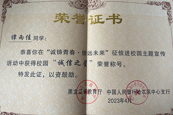 “诚铸青春 信远未来”征信宣传进校园主题宣传活动历时一年,由黑龙江省教育厅、中国人民银行哈尔滨中心支行共同开展,旨在深入贯彻习近平总书记关于抓紧建立覆盖全社会的征信系统的指示精神,持续深化诚信宣传教育,发挥诚信典型的示范引领作用,促进征信和诚信宣传教育进一步贴近在校青年。学院团委广泛宣传、积极发动,二级团组织密切配合、公平遴选,推荐谭雨佳等同学代表学院参加评选,最终,谭雨佳同学荣获“诚铸青春 信远未来”征信宣传进校园主题宣传活动——校园“诚信之星”。