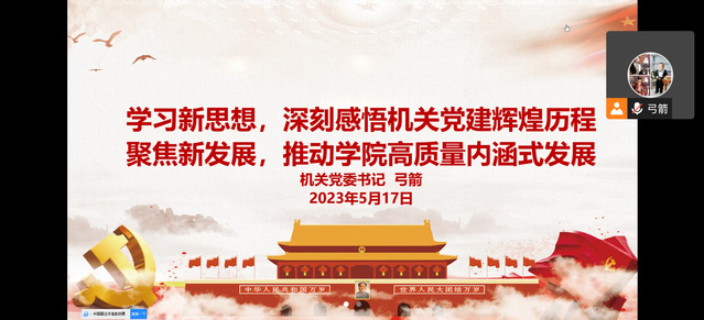 为深入开展学习贯彻习近平新时代中国特色社会主义思想主题教育,推动主题教育走深走实,5月17日下午,机关党委书记弓箭以《学习新思想,深刻感悟机关党建辉煌历程 聚焦新发展,推动学院高质量内涵式发展》为题,为机关党委各党支部书记、委员和联络员等100余名党员讲授了主题教育专题党课。