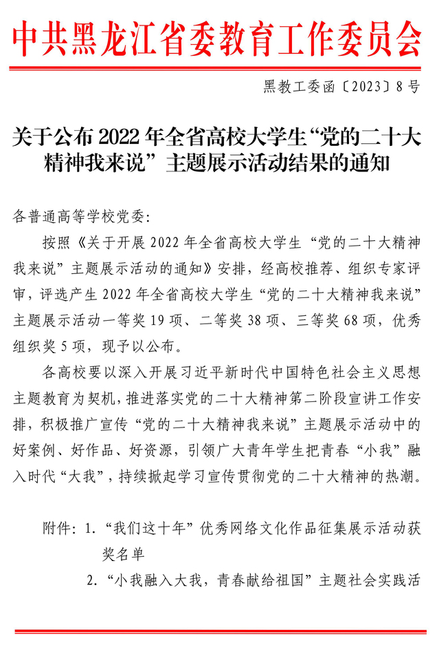 近日,经高校推荐、省厅组织专家评审,2022年全省高校大学生“党的二十大精神我来说”主题展示活动评选结果公布,学院7部作品分别荣获二、三等奖。