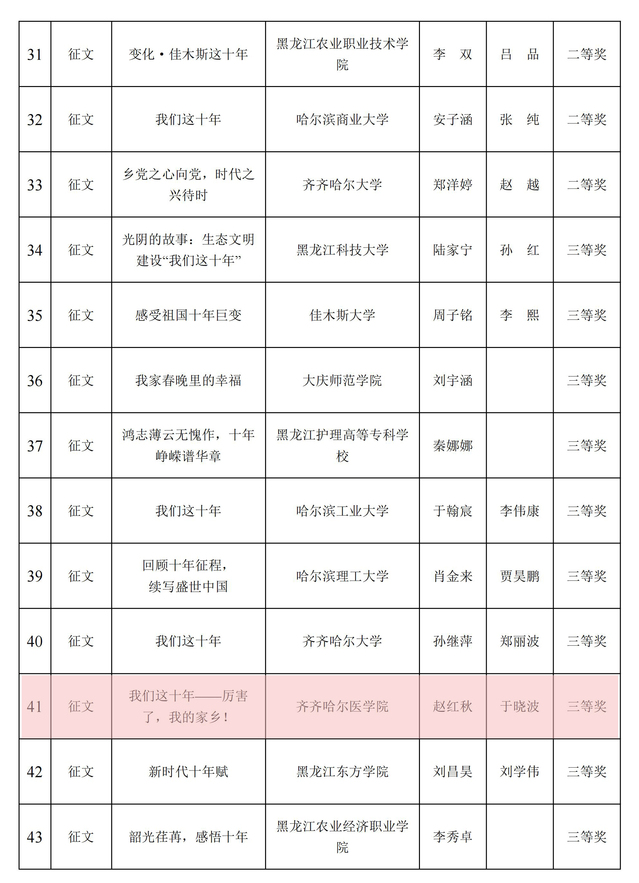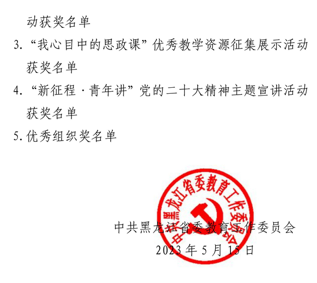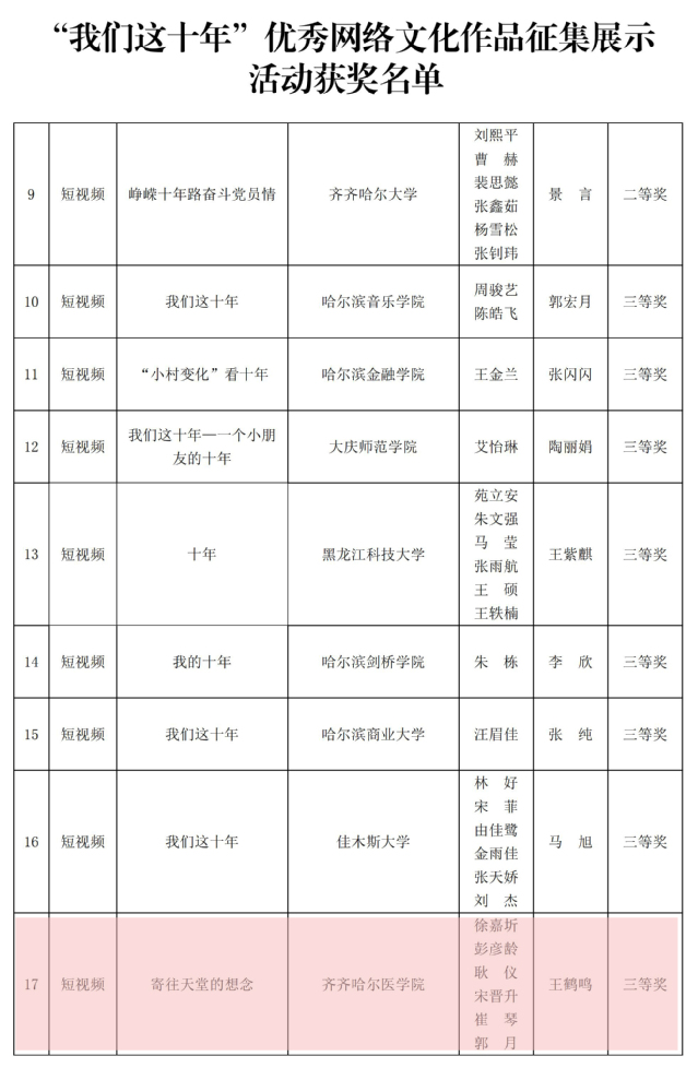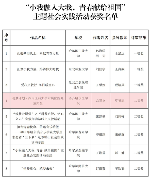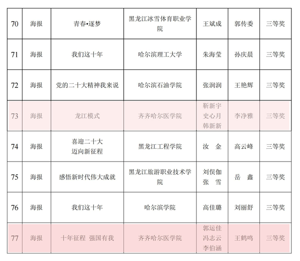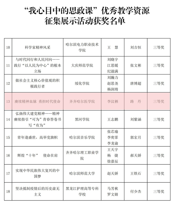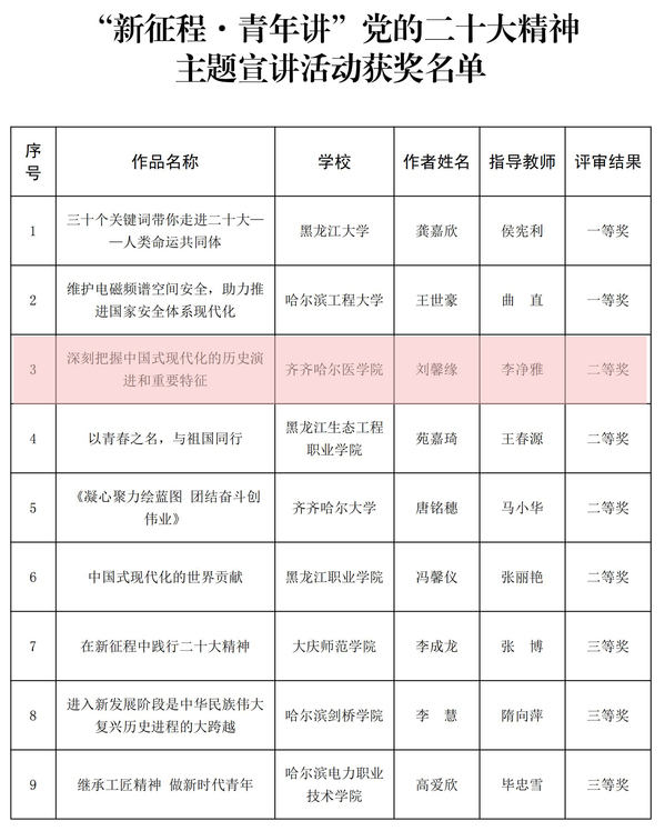 按照省委教育工委相关要求,学院积极征集选送“党的二十大精神我来说”优秀作品和案例,最终有7部作品获奖。其中,宗羽杰同学的作品《逐梦计划·西南医科大学附属医院儿童关爱》荣获“小我融入大我,青春献给祖国”主题社会实践活动二等奖;刘馨缘同学的作品《深刻把握中国式现代化的历史演进和重要特征》荣获“新征程·青年讲”党的二十大精神主题宣讲活动二等奖;徐嘉圻等同学的短视频作品《寄往天堂的想念》、赵红秋同学的征文作品《我们这十年——厉害了,我的家乡》、靳新宇等同学的海报作品《龙江模式》、郭运佳等同学的海报作品《十年征程 强国有我》荣获“我们这十年”优秀网络文化作品三等奖;李汶栖同学的作品《赓续精神血脉 勇担时代使命》荣获“我心目中的思政课”优秀教学资源征集展示活动三等奖。