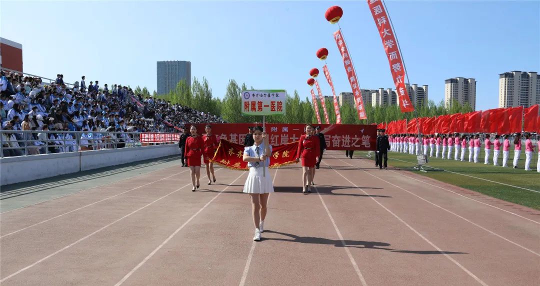 五月的齐医,书香弥漫,繁花似锦;五月的齐医,青春昂扬,热情奔放。5月18日,齐齐哈尔医学院第三十二届运动会隆重开幕。开幕式上,我院领导班子率领专家方阵、护士方阵、学生方阵以及身着达斡尔民族服装的梅里斯分院职工400余人,迈着整齐的步伐,喊着响亮的口号,走过主席台前,接受主席台领导的检阅。
