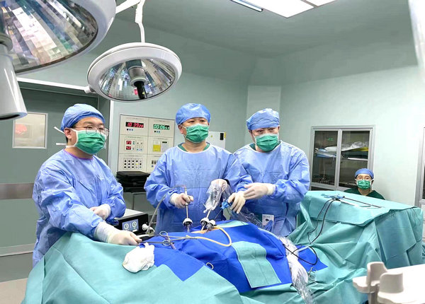 泌尿外科一病区副主任董波(中)为患者行后腹腔镜下半尿路切除手术
