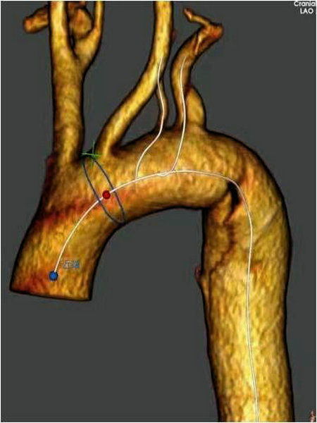 术前准备:患者平躺后全麻,双侧腹股沟及左侧肱动脉术区消毒,对左侧肱动脉、左侧股动脉分别进行穿刺同时置入动脉鞘,游离右侧股动脉进行开口,沿股动脉入金标猪尾导管进入真腔至升主动脉,进行造影,位置与术前CTA检查结果一致。