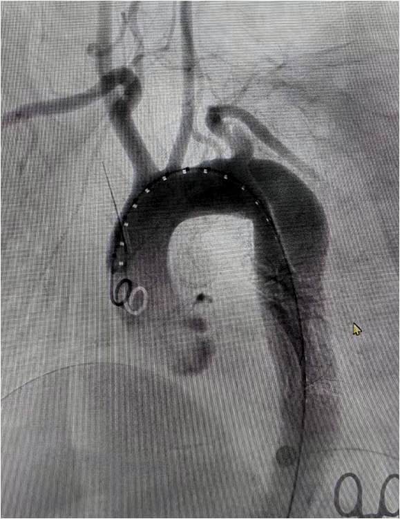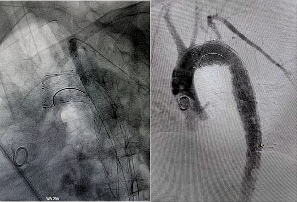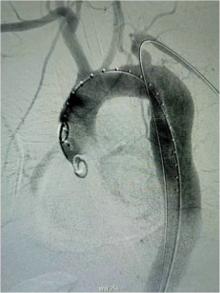 释放支架主体及分支并后扩分支支架:从右侧股动脉引入超硬导丝至升主动脉,沿着超硬导丝送入输送系统并上推至升主动脉,助手配合牵拉分支导丝,使分支支架进入左锁骨下动脉,并使支架窗口对准左侧椎动脉开口,经造影确认支架定位准确后,快速释放主体支架,助手配合牵拉导丝释放分支支架。撤出支架主体,由左侧股动脉导入8-80球囊扩张支架支架,沿左侧股动脉入金标导管至升主动脉,造影显示支架有效封堵夹层破口,无移位和内漏现象发生,左椎动脉与左锁骨下动脉血流通畅,手术圆满成功。