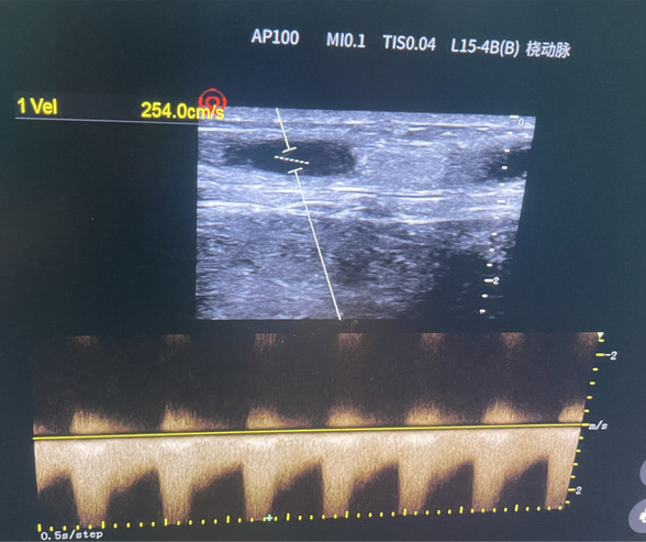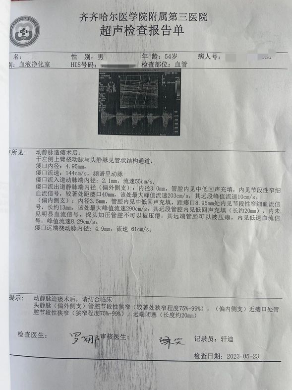 患者李某,男,60岁,已规律在我院透析中心规律血液透析4年,因患者既往糖尿病血管条件较差,患者及医护人员对该患者的血管通路保护倍加细心。5月23日,患者动静脉内瘘震颤减弱,穿刺上机后血流量无法满足透析要求最后被迫下机,追溯原因患者因血糖降低而导致的一过性血压降低,经过肾内科主治医师李双宇初步判断,考虑内瘘血栓形成导致内瘘失功。对于需要接受长期“血液透析”治疗的患者来说,一旦发生动静脉内瘘狭窄,造成内瘘闭塞,最终会使血液透析的“血管通路”失去功能,患者赖以生存的“生命线”将会被切断。