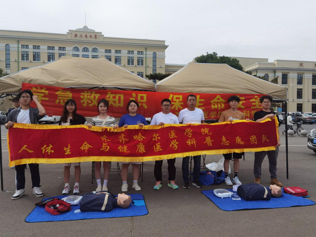 生命科学馆作为黑龙江省科普示范基地,承载着常态化服务社会的职责,5月31日,生命科学馆科普团队携解剖学教研室全体教师,以“学急救知识,保生命安全”为主题,在齐齐哈尔市工人文化宫广场进行一场心肺复苏急救科普活动。齐齐哈尔市融媒体中心新闻综合频道《直播鹤城》栏目的记者和《齐齐哈尔新闻》栏目的记者对基础医学院副院长纪慧进行现场采访。纪慧副院长讲述了此次活动的意义,首先,此项活动旨在提高社会群众对心肺复苏急救的认知和实际操作能力,让普通民众面对心脏骤停患者时的“不会救、不敢救、没经验”转变为“会救、敢救、方法正确”,人们可以边等待,边施救,有效提升了患者的存活概率。其次,从每一位医学生步入神圣医学殿堂的那一刻起,“健康所系,性命相托”便成为了他们的“初心使命”。