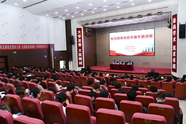 为进一步发挥齐齐哈尔医学院与齐齐哈尔市公安局建立的“维护高校安全稳定协作机制”作用,推动校园安全工作高质量发展,5月31日下午,学院与齐齐哈尔市公安局建华分局在图书行政楼二楼多功能厅联合举办了防范电信诈骗专题讲座。讲座由学院保卫处处长孙立强主持,各二级学院、研究生院学生辅导员和学生代表300余人听取了讲座。