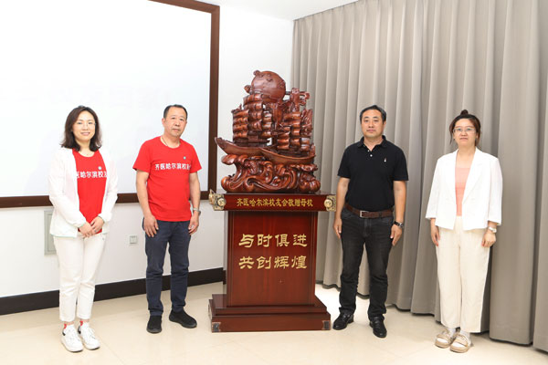 座谈会上,哈尔滨校友会秘书长、2006届校友李婷介绍了校友会近几年的工作及活动开展情况;副会长吕俐丰宣读了学院校友会文件《关于同意哈尔滨校友会人员调整的批复》,并代表哈尔滨校友会向母校赠送了“与时俱进 共创辉煌”船雕摆件,祝愿母校早日实现医科大学梦想。齐占朋处长受齐医校友会常务副会长、学院党委副书记崔光成委托,代表学院校友会对校友返校交流表示热烈欢迎,对哈尔滨校友会近年来开展的各项文体活动、搭建的学术交流平台予以肯定,对校友会疫情防控期间对母校的持续关注支持表示感谢。他向校友们介绍了学院近年来的发展成就,希望哈尔滨校友会越办越好,祝愿齐医校友在未来取得更大成绩。同时,希望校友们一如既往地关注、支持母校发展,搭建沟通交流平台,共谱齐医美好新篇。