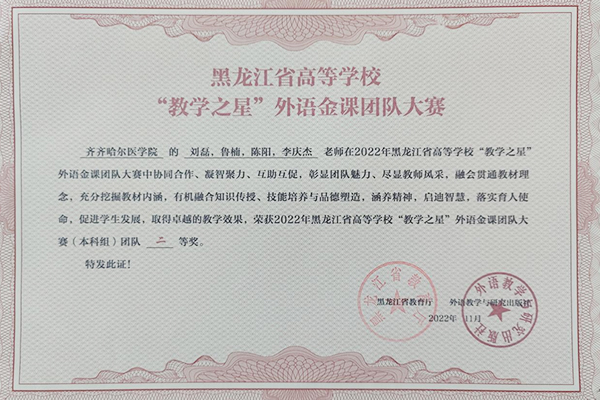 6月2日,黑龙江省本科高校外语教育改革创新与高质量发展工作会议召开,会上公布了2022年黑龙江省高等学校第四届“教学之星”外语金课团队大赛(本科组)获奖结果。由学院外语教研部刘磊、鲁楠、陈阳和李庆杰4位教师组成的参赛团队荣获本科组二等奖。