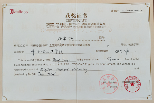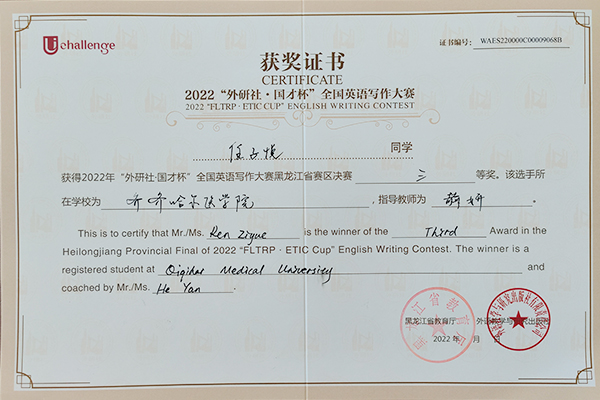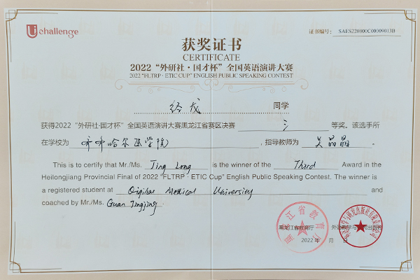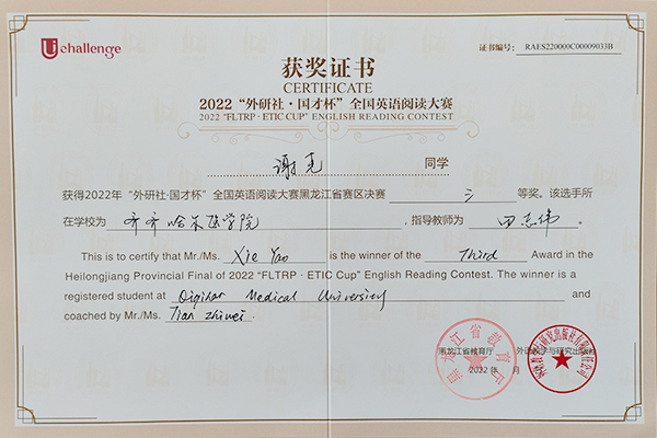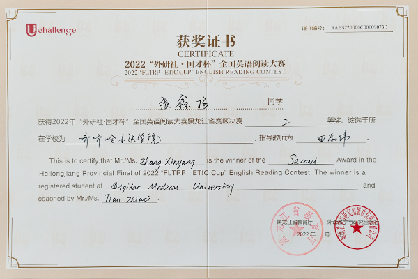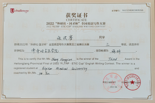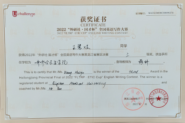 近日,2022年“外研社·国才杯”全国大学生英语阅读、写作、演讲大赛黑龙江省赛区决赛结果揭晓,学院选拔推荐的7名选手均取得了优异成绩。其中,2021级生物医学工程专业张鑫杨同学、2020级精神医学专业邓家驹同学荣获阅读大赛二等奖,2021级临床医学专业谢尧同学荣获阅读大赛三等奖;2020级口腔1班王慧煜同学、2020级医学检验技术专业任子悦同学、2019级病理2班张洪骞同学荣获写作大赛三等奖;2019级影像2班经龙同学荣获演讲大赛三等奖。同时,田志伟、赫妍、关晶晶3位老师荣获指导教师奖。