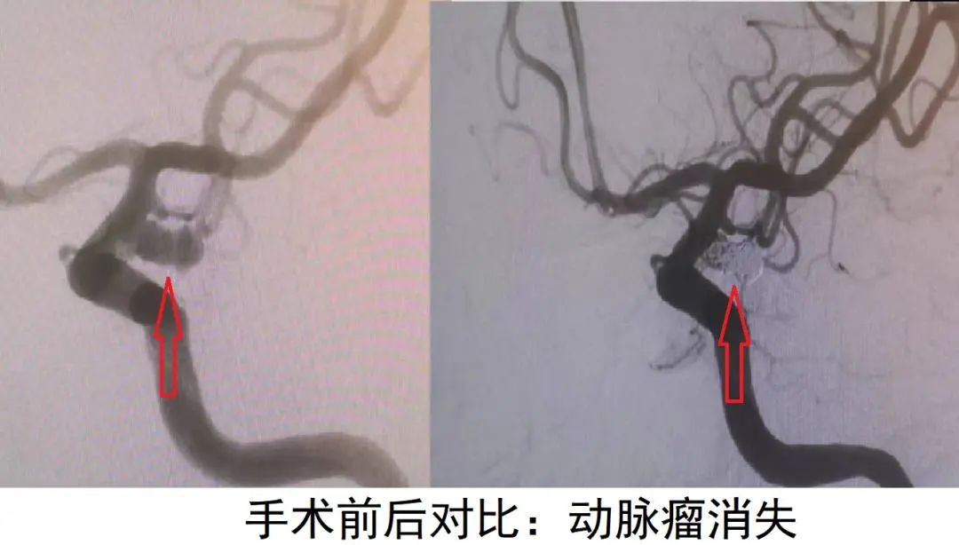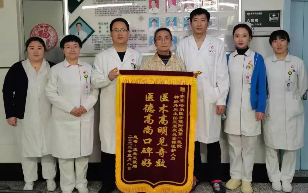 神经外科二组王宝庆副主任、郭知伟医生争分夺秒,如实与患者家属交待病情,将最优方案告诉家属。在家属的理解和配合下,医务人员顺利为患者进行颅内动脉瘤介入栓塞术,挽救患者生命于危难间。术后,王先生恢复良好,出院时基本恢复到术前正常水平。