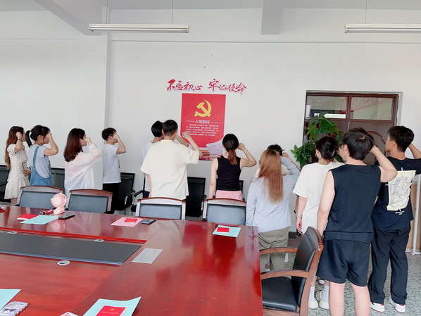 首先,党支部书记邹萌为支部党员发放《党章》,并带领大家共同学习了总纲部分,希望全体党员自觉学习党章、遵守党章、贯彻党章、维护党章,自觉加强党性修养,为党分忧、为国尽责、为民奉献。全体党员面向党旗高举右拳、重温入党誓词。