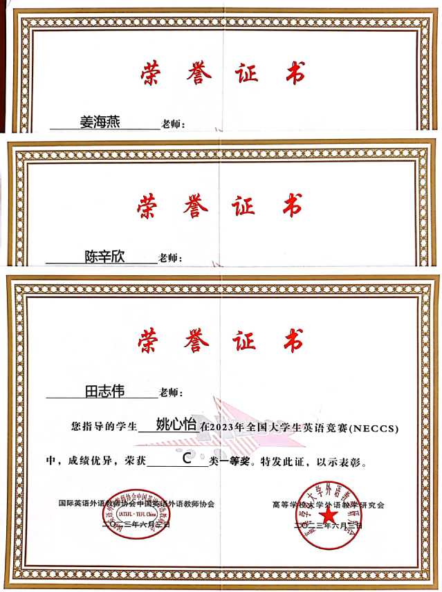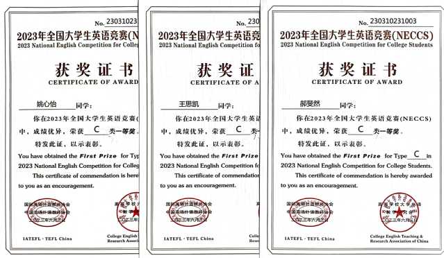 近日,2023年全国大学生英语竞赛决赛成绩揭晓,学院再次荣获佳绩。其中,2018级精神医学专业学生姚心怡、2020级临床医学专业学生王思凯、2019级临床医学专业学生郝斐然荣获C类全国一等奖;18名学生获C类全国二等奖;30名学生获C类全国三等奖;2022级药学专业研究生毛家琳荣获A类全国二等奖、潘旭获A类全国三等奖。学院荣获“优秀组织奖”,外语教研部教师田志伟、姜海燕、陈辛欣获“全国一等奖”指导教师称号,田明莉等教师获“全国二等奖”指导教师称号,孟婷老师获“个人优秀组织奖”称号。