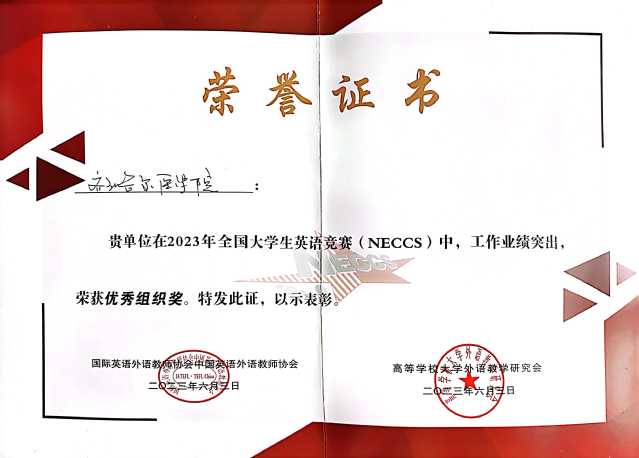 全国大学生英语竞赛(NECCS)是我国规模较大、参与人数众多的全国性大学生英语综合能力竞赛,在我国大学英语教学改革不断发展和大学就业日趋严峻的形势下,该竞赛越来越受到各地各高等院校和广大大学生的重视,其参赛成绩和获奖证书已成为高校教育行政部门和教研部门、教师评优、晋升和评职的重要佐证,是学生考研、出国留学、继续深造和优先就业的重要依据。学院自参加大赛以来,多次获得优异成绩,是对学院大学英语教学改革成果的检验,充分体现了学院特色应用型本科人才培养学以致用的特点。