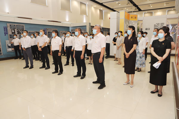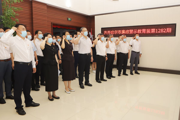 在讲解员引导下,全体党员干部通过展板、实物、图片、视频等,了解了近年来查处的党员干部违纪违法和腐败典型案例,更加直观地感受到违纪违法贪污腐败者所付出的沉痛代价。在展厅内,大家还学习了焦裕禄等6名时代勤廉楷模榜样的光荣事迹,并在党旗前重温了入党誓词。