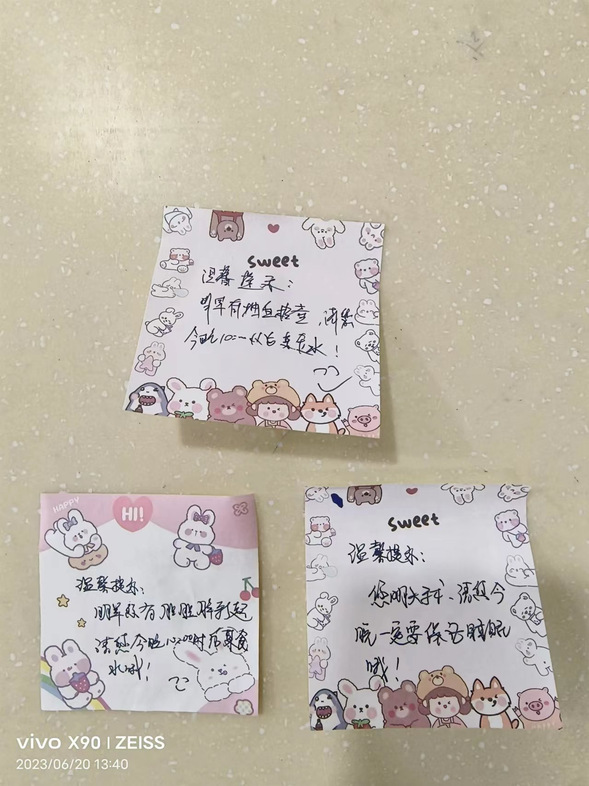 细微处的贴心举动最是动人心弦,妇一科护理人员在工作中开展人性化护理服务,满足患者身体、心理、社会及精神方面的多层次需求,为患者提供更温暖的服务。根据患者的不同情况,手写温馨提示卡。这不仅体现了护士在护理工作中的主动关怀,更是护士对患者尽心护理服务的象征。小小的提示语,是护患沟通的良好纽带,能够建立信赖、关爱的互动关系,不断增进护患情。住院患者王阿姨说:“人老了,记性不好,总是记不住要做检查,可是吃了早饭就耽误了检查。现在有了这个小卡片,清楚的提醒了我什么时候需要空腹做检查,特别方便。”