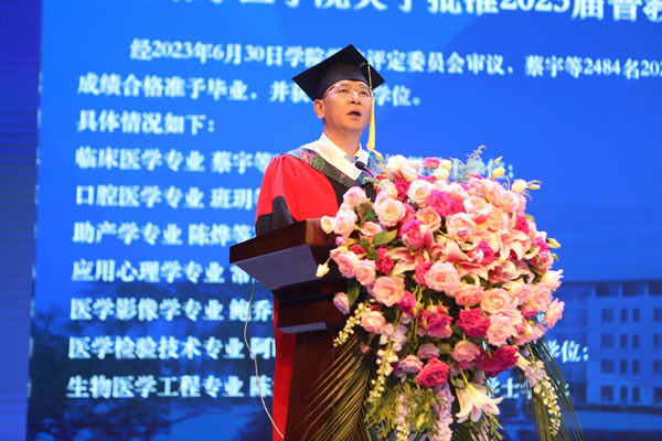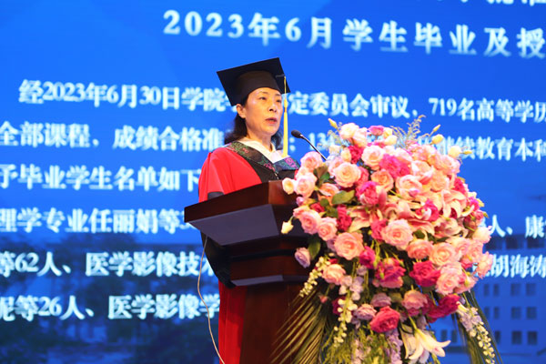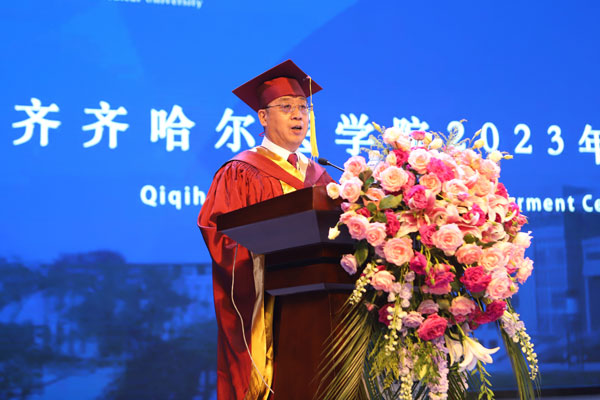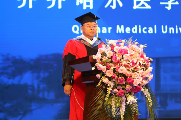 学院院长赵光发表毕业寄语,回顾了学生们在学校学习生活的点点滴滴,对即将踏上人生新征程的莘莘学子提出三点希望。希望同学们树立远大理想,做信仰坚定的时代新人;希望同学们守护人民健康,做大医精诚的时代新人;希望同学们扎根祖国大地,做勤勉奉献的时代新人。他指出,“青春如初春,如朝日,如百卉之萌动,如利刃之新发于硎,人生最宝贵之时期也。”他希望同学们时刻铭记“大学至善、大医精诚”的校训,弘扬“自强不息、甘于奉献”的齐医精神,牢记“为祖国医药卫生事业的发展和人类身心健康奋斗终生”的使命,不惧困难、不畏艰险,挑战自我、超越自我,始终保持昂扬向上、奋发图强的精神面貌,去开拓、去创造属于自己的美好人生!