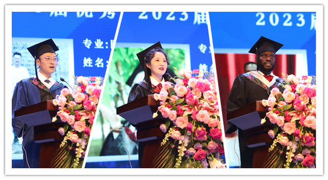序典中,播放了《岁月匆匆 惟愿总相逢 毕业快乐——2023届毕业生宣传片》,学生代表合唱了《再见》《此生不换》《不说再见》《匆匆那年》等歌曲,将现场气氛迅速炒热,师生们纷纷合唱呼应。