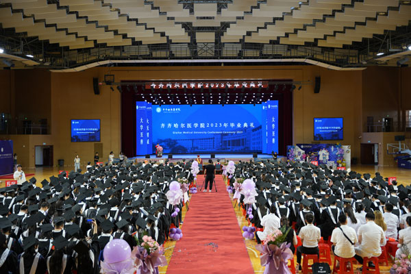 夏花绚烂,毕业的骊歌又一次在大医园响起。6月30日上午,齐齐哈尔医学院2023年毕业典礼暨学位授予仪式以线上线下相结合的形式举行。学院领导班子成员、学位评定委员会成员、相关职能部门负责人,二级学院及附属医院书记,附属医院副院长和辅导员代表,学生家长代表与600余名毕业生代表线下参加毕业典礼,3000余名2023届毕业生“云端观礼”,线上观礼人次达2.97万人次。