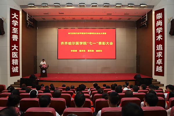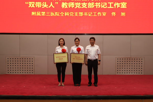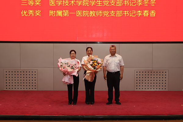 党委书记顾长虹为获得黑龙江省公办高校党建“样板支部”、首批黑龙江省高校“双带头人”教师党支部书记工作室的附属第二医院内科第二党支部、附属第三医院全科党支部授牌;副院长、党委常委史耀忠为第五届省高校党支部书记素质能力大赛获奖选手医学技术学院学生党支部书记李冬冬、附属第一医院教师党支部书记李春香献花;副院长、党委常委丛明宇、毕红霞、张可勇,分别为受表彰的优秀共产党员、优秀党务工作者、先进基层党组织代表颁发了荣誉证书和奖牌。
