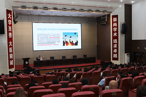 为深入贯彻落实习近平总书记对研究生教育工作的重要指示和全国、全省研究生教育会议精神,提高我校研究生指导水平,加强研究生培养经验交流,6月27日,学院邀请哈尔滨医科大学研究生院基础医学院副院长李晓波教授、第一附属医院外科基础教学主任陶维阳教授,在图书行政楼二楼多功能厅对学院研究生导师及管理人员进行培训。会议由研究生院副院长卢长方主持,学院研究生导师、管理人员及相关人员300余人参加培训。