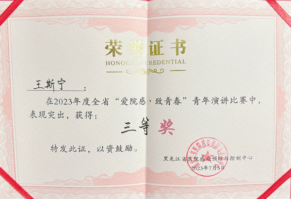 为提高医务人员院感防控意识,大力弘扬医院感染管理工作者的奉献精神,激发青年医务人员积极参与感控,传播医院感染文化,7月5日,齐医附属二院王斯宁在黑龙江省疫病预防控制中心举办的“爱院感•致青春”演讲比赛中荣获三等奖。