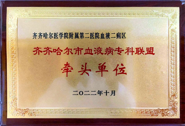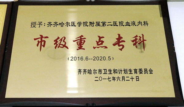 2012年评为市级重点学科,并评为齐齐哈尔市重点学科梯队-血液重点专科梯队。2022年牵头成立市血液病联盟,联合七区九县二级以上医院相关科室及专家,积极推动血液病的基层普及。2023年6月被批准为国家重点专科建设项目单位,国家财政部投入资金500万。为齐齐哈尔市、齐齐哈尔医学院、齐齐哈尔医学院附属第二医院的重点科室、齐齐哈尔市领军人才梯队、齐齐哈尔市医学会血液病分会主委单位、齐齐哈尔市血液病质控主委及齐齐哈尔市血液病联盟牵头单位。