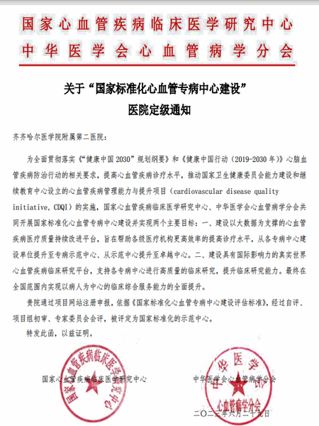 齐医附属二院将以获评授牌“国家标准化冠心病中心”示范中心为契机,再接再厉,持续完善学科建设,为深入推动我国心血管疾病防治体系建设,实现全国心血管疾病诊疗质量均质化,提高黑龙江省冠心病诊疗水平、助力医院高质量内涵式发展和造福龙江百姓做出应有的贡献。