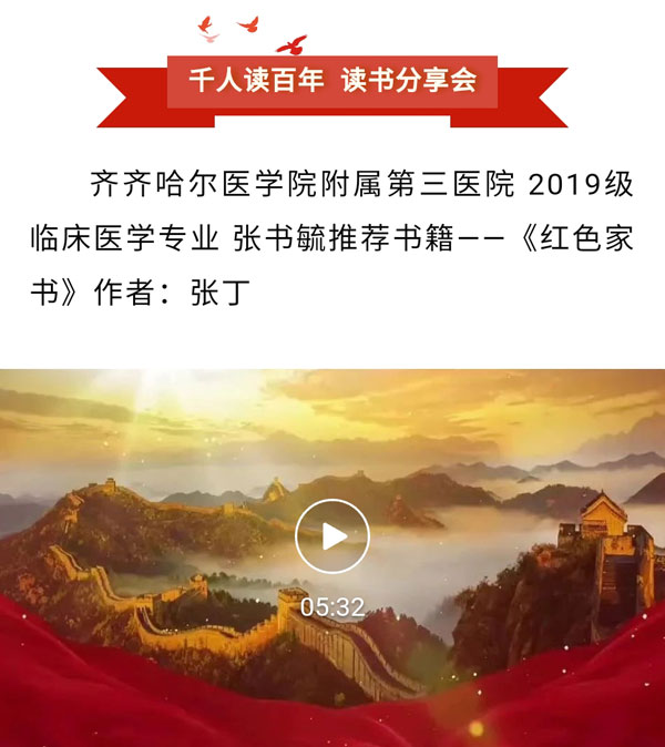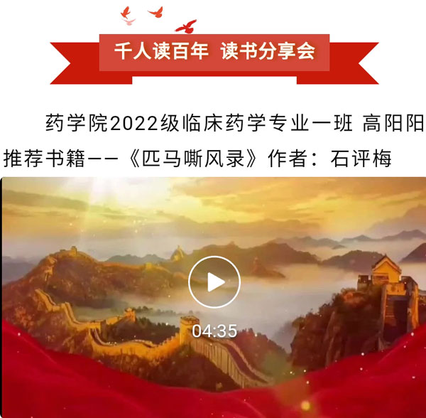 活动倡导广大青年学生积极阅读党史、人物传记、廉政教育等方面书籍,进一步掌握中国共产党的发展历程、了解可歌可泣的英雄人物事迹、学习廉政知识培养廉洁自律意识,在阅读分享中体悟和汲取真理力量,学好讲好用好党的创新理论,真正做到用党的创新理论武装头脑。读书分享会得到了广大学子的热烈响应,累计收到300余部读书分享作品。经过各二级学院、附属医院,以及学生工作部、纪委办公室的层层筛选,最终有17部学生作品获评优秀作品,并在“齐医学子”微信公众号等平台进行推送展示。