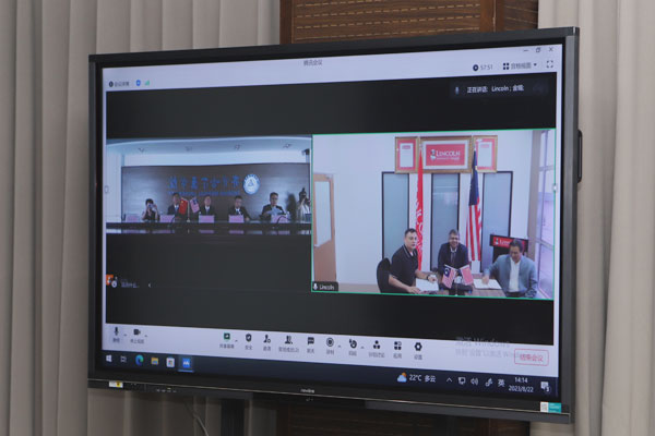 8月22日下午,学院副院长于海涛在图书行政楼1804会议室,与马来西亚林肯大学学院院长AMIYA BHAUMIK等举行线上会晤。国际交流合作处处长王敬春、副处长许伟岚、研究生处副处长卢长方等参加会晤。