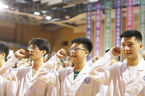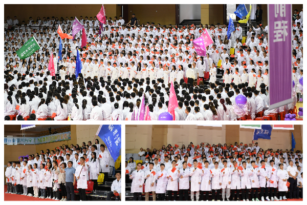 伴随着张可勇副书记的介绍,2023级本科生和研究生以学院为单位,摇旗呐喊,“乘风破浪 气宇轩昂 精卫有我 共创辉煌”“强基固本 求知励志 不忘初心 厚德载医”“药济天下 学贯中西 筑梦未来 强我齐医”“自强不息 敢闯敢拼 病理学院 锋芒如箭”……嘹亮的口号声此起彼伏,响彻全场。随后,全体新同学在团委书记刘柏人的带领下,宣读了医学生誓言。