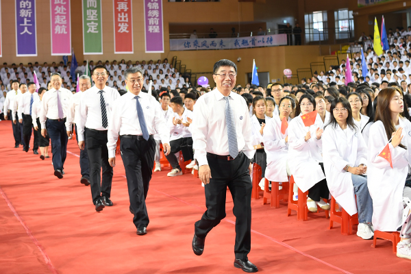 赵光院长讲话,向来自全国各地的2023级新同学表示热烈欢迎,向一路陪伴学生成长成才的老师和家长表示衷心感谢。他简要介绍了学院77年来在人才培养、科学研究等方面取得的成绩,并作为校长和师长,对新同学提出四点希望。希望全体新同学志存高远,做不负韶华的齐医学子;见贤思齐,做勇担时代重任的齐医学子;笃行不怠,做追求卓越的齐医学子;持之以恒,做坚韧不拔的齐医学子,在求学过程中树立荣校之志、培养爱校之情、开启兴校之行,主动融入学校事业发展建设中,为建成高水平特色应用型本科示范高校、创建医科大学贡献力量,伴随着学校的发展而不断成长进步,在更大的人生格局中彰显生命的意义,绽放人生的光彩。