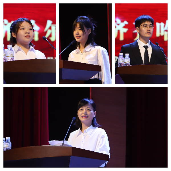 护理学院2021级护理学专业梁丹同学作为在校生代表发言,希望学弟学妹立志做有理想、敢担当、能吃苦、肯奋斗的新时代好青年。精神卫生学院2023级精神医学专业刘思甜同学作为本科新生代表发言,分享了自己在齐医按下人生新起点的开机键,即将开始谱写齐医青春故事的奋斗历程。研究生院2023级基础医学专业王维帅作为研究生新生代表发言,表达了掌握扎实的基础医学知识,不断推动临床医学发展的信心和决心。医学技术学院生物化学教研室主任李淑艳老师作为教师代表发言,倡议全体新同学树立明确的学习目标,胸怀天下,学会与人相处,不断适应新的环境。