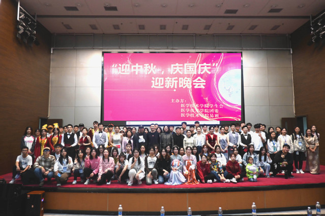 暑退九霄净,秋澄万景清。为了迎接中秋、国庆双节的到来,也为了欢迎2023级新同学的加入,医学技术学院于2023年9月24日晚在图书行政楼多功能厅举办“迎中秋,庆国庆”为主题的迎新晚会。本次迎新晚会经医学技术学院党委副书记佡思维全程指导,由医学技术学院学生会、团委和易班共同筹划完成。医学技术学院党委书记孙贺,副院长张浩、温宪春和全体辅导员出席了本次晚会。