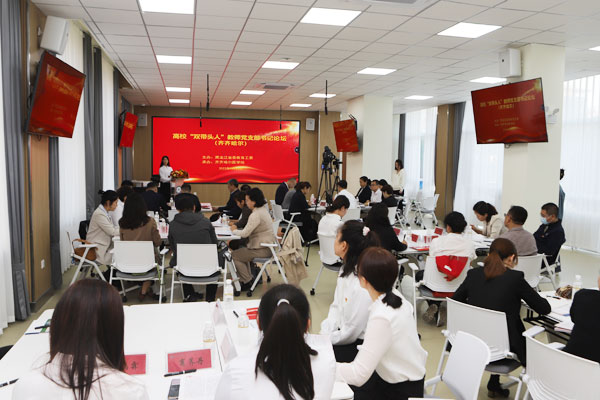本次论坛由黑龙江省委教育工委主办,齐齐哈尔医学院党委承办,采取线上线下相结合的方式进行。论坛在学院形态楼智慧教室设主会场,其他在齐及周边8所高校设分会场,200余名高校党委组织部主要负责人、党建工作干事、“双带头人”教师党支部书记以腾讯会议的形式线上参会。