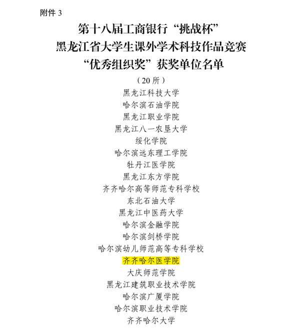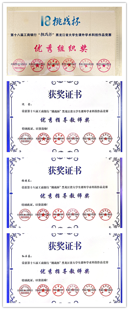 近日,由团省委、省科协、省教育厅、省科技厅、省社科院、省学联联合举办的第十八届工商银行“挑战杯”黑龙江省大学生课外学术科技作品竞赛落下帷幕。学院在“挑战杯”竞赛中取得了新突破,学院荣获第十八届“挑战杯”全国大学生课外学术科技作品竞赛省赛优秀组织奖。张晓东、孙石磊、沈雷三位教师荣获“优秀指导教师”荣誉称号。