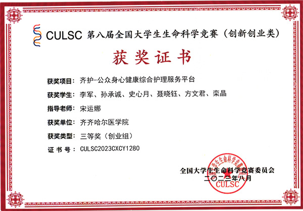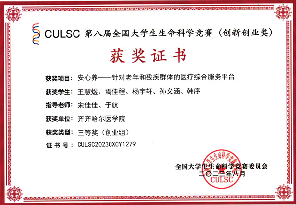 全国大学生生命科学竞赛是教育部认可的57项全国大学生学科竞赛之一,大赛由全国大学生生命科学竞赛委员会主办。本届大赛设有创新创业类、科学探究类两个赛道。经二级学院推荐,招生就业处审核、指导后组织报名,最终有14支队伍参赛。其中基础医学院李军团队的《齐护-公众身心健康综合护理服务平台》、口腔医学院王慧煜团队的《安心养—针对老年和残疾群体的医疗综合服务平台》两个项目荣获创新创业类国家三等奖。