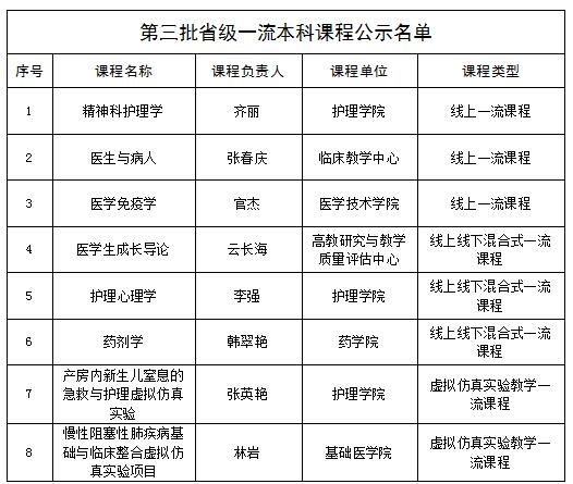 多年来,学院始终贯彻落实习近平总书记关于教育的重要论述和全国教育大会精神,全面落实新时代全国高等学校本科教育工作会议要求,以及国务院办公厅《关于加快医学教育创新发展的指导意见》等文件精神。全面落实立德树人根本任务,坚持“以本为本”,推进“四个回归”,以“双万计划”为契机,将一流本科课程建设作为办好一流本科教育的关键抓手,出台《一流本科教育建设规划》《特色应用型本科示范高校建设规划》《“十四五”一流课程建设规划》《教学建设业绩奖励实施办法(试行)》。树立课程建设新理念,加大经费投入力度,推进课程改革创新,推行以赛促建,严格课程管理,加强教材建设,修订教学大纲,优化教学内容,强化课程思政,创新基层教学组织,提高教师教学能力,实施课程评价,完善以质量为导向的课程建设激励机制。通过优秀课程教学示范、课程思政专题研讨会、教师教学创新大赛、在线教学培训等多种方式引导一线教师树立课程建设新理念,全面推进五大类金课建设。前期教务处根据教育部和省教育厅文件精神抢前抓早、积极组织、认真谋划,邀请了哈尔滨工业大学、哈尔滨医科大学专家来院,针对如何准备申报国家级、省级一流课程进行现场培训指导,为拟申报课程精准“把脉”。组织开展省级一流本科课程成效评价暨国家级一流本科课程五年建设规划论证会,对标对表进一步加深对一流课程建设标准的理解,掌握课程建设的核心要素,为提升课程建设质量奠定基础。各课程所在二级学院积极承担课程建设主体责任,精心准备,严格把关,各相关部门各司其职、通力合作,最终取得了可喜成绩。