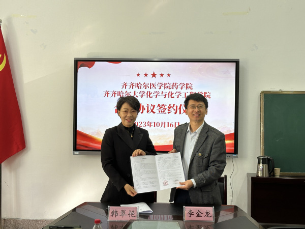 10月16日上午,齐齐哈尔医学院药学院与齐齐哈尔大学化工学院签署了制药工程专业教学资源共享合作协议。齐大化工学院院长李金龙与药学院院长韩翠艳代表双方致辞并交换意见。齐大化工学院副院长尹彦冰、董国华、化工原理教学与实验中心主任辛杨、制药工程系教师齐丽颖、教学科研办秘书楚艳萍,我校药学院副院长崔红霞、王玉春、制药工程专业负责人刘磊及化工原理课程负责人卜明、教务科负责人王栾及地方药物标本馆负责人张宏莲等出席签约仪式。