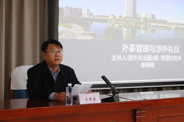 10月21日下午,省外事办公室出国(境)管理处处长李晓明来院开展因公出国(境)审核审批讲座和公务着装礼仪、外事礼仪培训。齐齐哈尔医学院、齐齐哈尔大学、齐齐哈尔高等师范专科学校、齐齐哈尔工程学院、齐齐哈尔理工职业学院、黑龙江交通职业技术学院等6所高校对外交流工作、因公出国(境)业务部门负责同志及工作人员听取讲座。