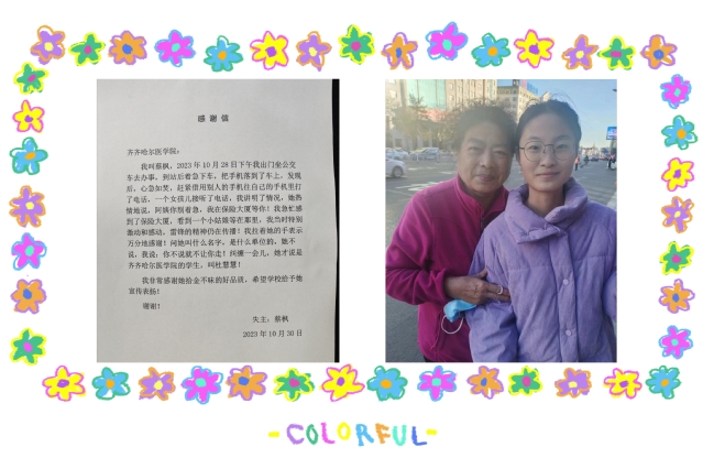 2023年10月28号下午,医学技术学院2023级医学影像学2班杜慧慧同学在乘坐13路公交车的途中“拾金不昧”,捡到一部手机之后积极地等待失主联系,改变自己行程,并主动将手机送还给失主。失主蔡枫阿姨表示,当自己丢失手机的那一刻很着急,所以就借其他人的手机拨打电话,杜慧慧不但及时的接听而且还配合失主将手机送回,对于杜慧慧的行为,失主表示非常感动,同时失主表示,通过杜慧慧的行为感到雷锋精神仍在继续,蔡岚阿姨通过齐齐哈尔医学院保卫处王天翔副处长找到该生,并转交为杜慧慧同学写的感谢信,以表蔡岚阿姨的感恩之情及对杜慧慧拾金不昧的品质表示赞扬。