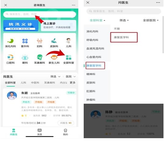 2、选择科室与医生,进入医生主页,点击【立即咨询】。