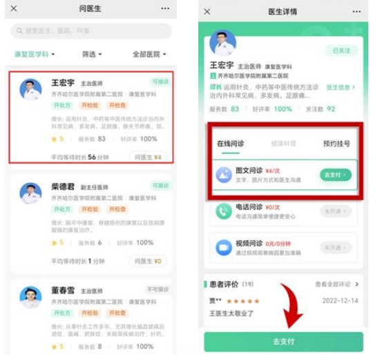 3、选择【问诊医生】(可接诊)咨询;点击【图文问诊】---去支付(咨询费4元)。