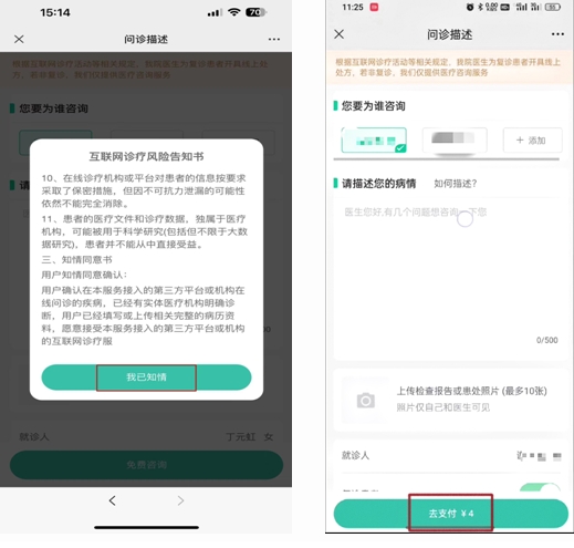 4、浏览“互联网医院诊疗风险告知书”---点击【我已知情】;输入【咨询问题】---【等待医生接诊】。
